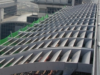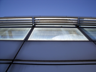 現代建築為了節省能源(隔熱、採光)與美觀設計,使用遮陽板做為〝綠建築〞改良的方式。