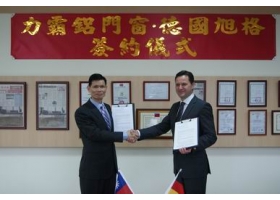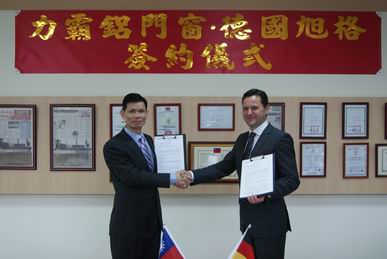 簽約儀式15日在「力霸鋁門窗」鶯歌新廠舉行,由力霸總經理周克賢與旭格駐台代表顧安德,代表雙方簽約。周克賢指出,不斷研發、精進學習是力霸鋁門窗長久不變的企業理念,透過與德格旭格公司的合作,除有利該公司爭取國內豪宅建案市場,在觀念啟發、技術升級與品質提升,均有極大助益。