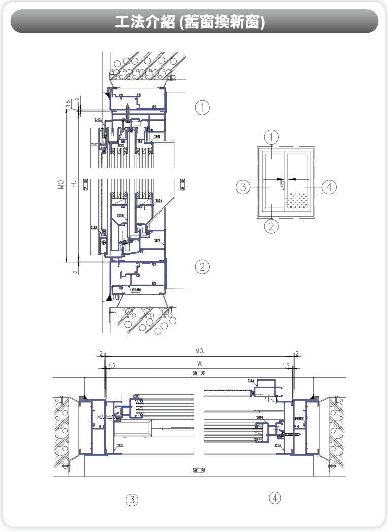 更舒適、更省能源,從您的窗戶開始。最聰明的改裝秘訣,關鍵在於挑選〝對的窗戶〞。 我們的新工法:先用覆蓋框包覆舊窗,再將新窗固定其上即可(詳圖),工法簡便、快速且可免於破壞牆體、大興土木,造成屋內 塵埃四起之困擾,此工法最適合滲水窗換裝,或普通窗換裝成隔音氣密窗,可免除拆舊窗痛苦之最佳選擇。